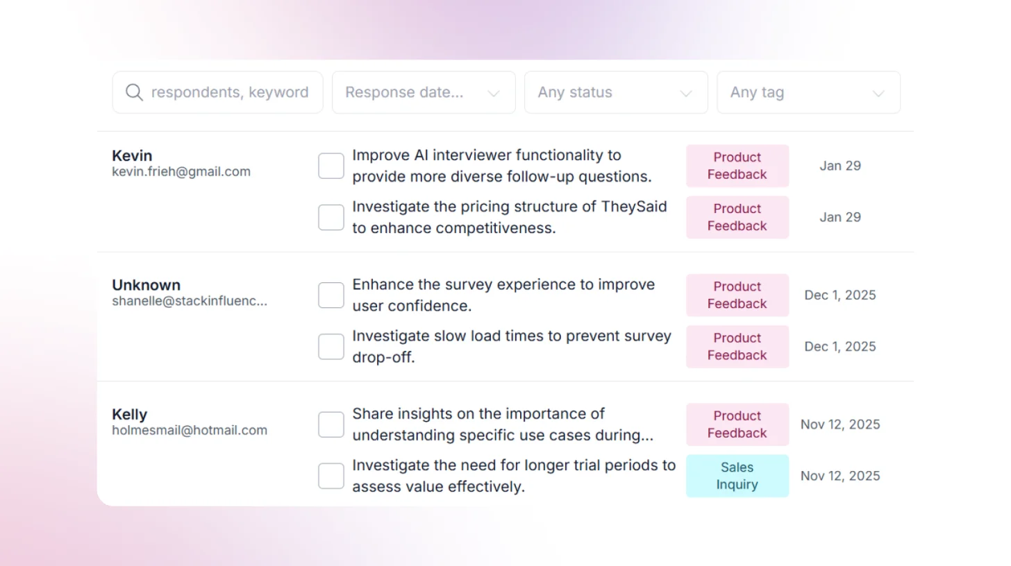 TheySaid is the AI user testing platform built for exactly this. Instead of waiting weeks for research results, TheySaid runs real two-way AI conversations with your users automatically asking follow-up questions, digging deeper into responses, and surfacing actionable insights.
