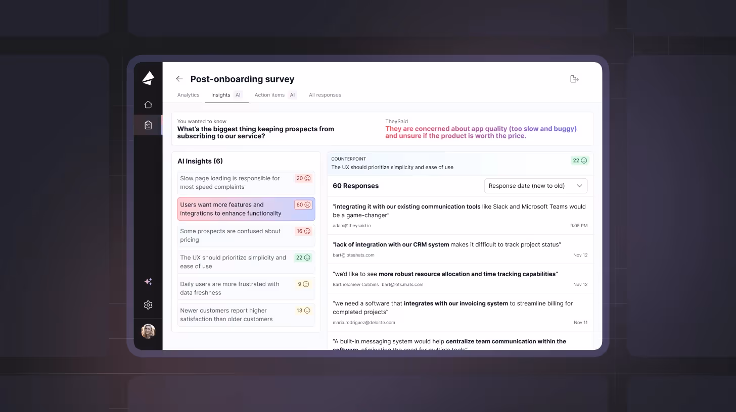 Enter AI tools like TheySaid. When a customer clicks "mildly annoyed," it asks "What specifically frustrated you?" and keeps the chat flowing naturally. Users forget they're even taking a survey.