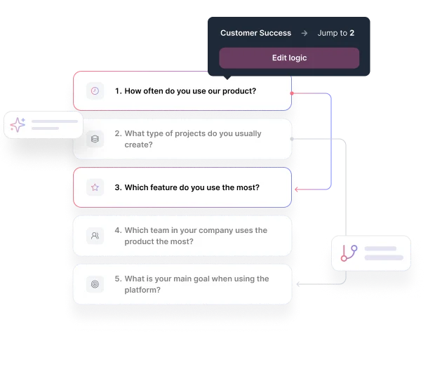 Click the "Branch" tab on your project page, then click any question to add rules. Use simple if-then logic: "If user selects 'pricing concerns,' skip to pricing questions" or "If satisfaction score is low, end with a feedback prompt."